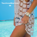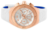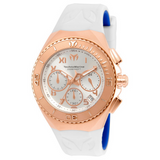 Technische Information: TECHNOMARINE Manta Ocean Ladies white/blue, quartz movement, diameter: 40 mm, stainless steel case 14k roségold plated, dial combination white with roségold indices, luminova markers, Chronograph- & stopping function, strap in color combination white/blue.
